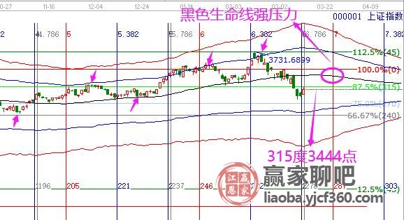 技術(shù)分析,10/11號日線時間窗口,大盤如期止跌反彈,今日滬指早盤高開震蕩上攻,盤中最大漲幅76個點,遇江恩波段百分比延伸線315度3444點附近回落,贏家江恩系統(tǒng)對走勢定性為3731波段下跌中的技術(shù)反彈修復(fù),反彈強壓力在極反通道黑色生命線,下個時間窗口是24號。