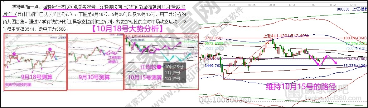 技術(shù)分析,滬指早盤高開上攻至極反通道120分鐘生命線3550(最高3550)后回落,按上周9、10號通過江恩箱、百分比測算,3460--3420是短線倉參考位,而反彈的壓力是3520--3540區(qū)間,目前在該區(qū)間內(nèi)震蕩,江恩時間工具顯示17號是本周時間窗口。這是贏家財富網(wǎng)大勢分析連續(xù)性的分析預判圖,9月18號、9月30號、10月15號,做好應對。