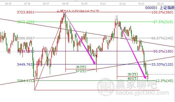 技術(shù)分析,28號(hào)滬深指跳空高開隨后拐頭向下再度走低,盤中9:48分鐘做江恩時(shí)空?qǐng)D,盤中支撐是45度3465點(diǎn),再次強(qiáng)調(diào)目前空間已超過時(shí)間,節(jié)后第一個(gè)交易日是時(shí)間窗口,空間上在幾大指數(shù)滬指、深成指、創(chuàng)業(yè)板、科創(chuàng)50,日線圖均在極反通道藍(lán)色下軌線附近,同時(shí)也在江恩百分比分割關(guān)鍵位,按歷史規(guī)律,指數(shù)到達(dá)此線后下跌空間有限,降速走震蕩或反彈,這里基本上判斷是階段反彈的底部區(qū)域,時(shí)間上最近一個(gè)窗口是2月7號(hào),此位置當(dāng)做反彈來應(yīng)對(duì),整體倉位控制在5成以內(nèi)。