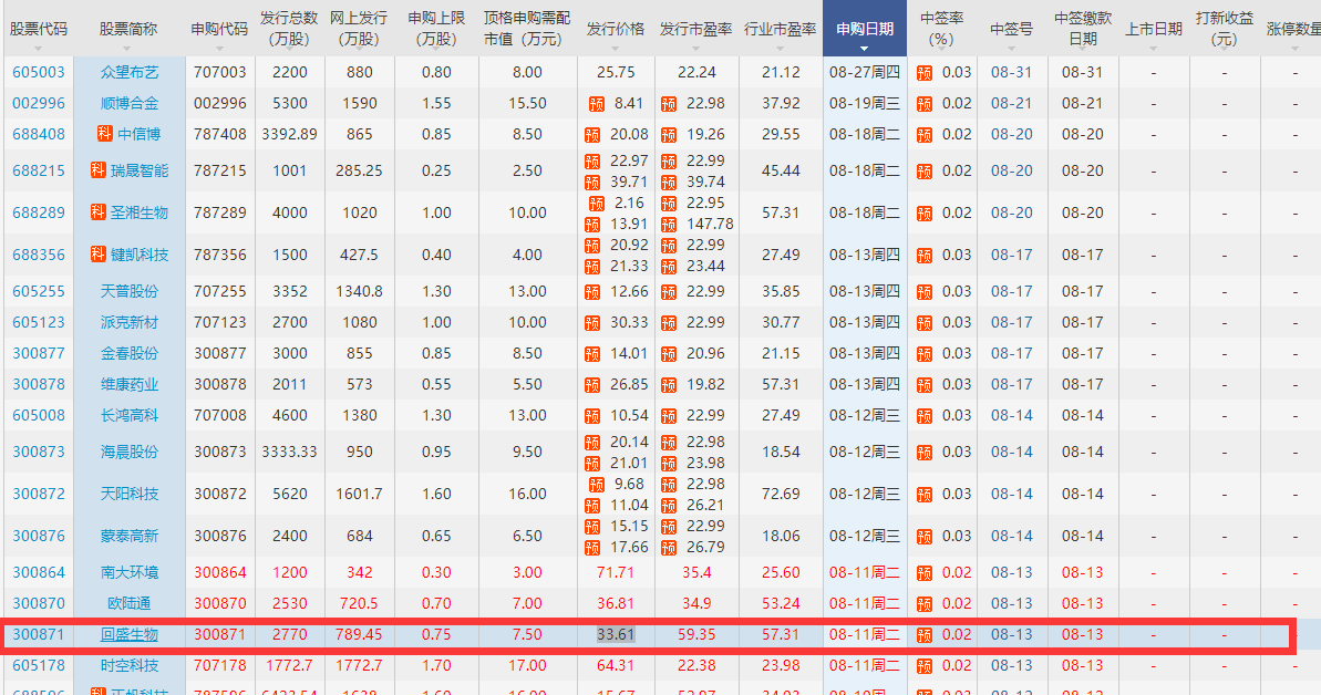 摘要: 近日回盛生物發(fā)布新股信息,回盛生物申購時間為2020年8月11日,本次創(chuàng)業(yè)板新股回盛生物行業(yè)市盈率57.31,發(fā)行市盈率為59.35,發(fā)行價格為33.61。想要打新的朋友們,可以關注其相關信息。