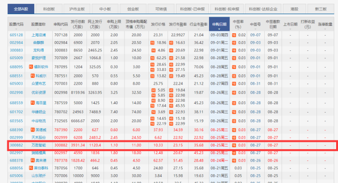 萬勝智能本次網(wǎng)下發(fā)行申購日與網(wǎng)上申購日同為2020年8月25日(T日),其中,網(wǎng)下申購時間為9:30-15:00,網(wǎng)上申購時間為9:30-11:30,13:00-15:00。
