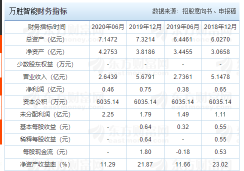 2016年至2019年,萬勝智能營業(yè)收入分別為3.80億元、4.75億元、5.15億元和5.68億元;歸屬于母公司股東的凈利潤分別為2121.37萬元、4422.20萬元、6460.98萬元和7527.54萬元。