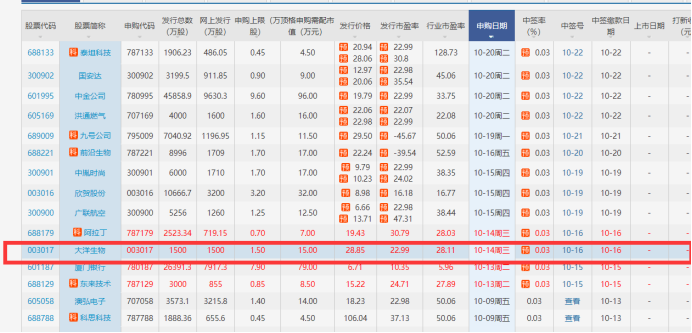 近日中小板003017【大洋生物(003017)、股吧】發(fā)布新股信息,大洋生物申購時間為2020年10月14日,中簽號公布時間為2020年10月16日,大洋生物行業(yè)市盈率28.03,發(fā)行市盈率為22.99,發(fā)行價格為28.85。