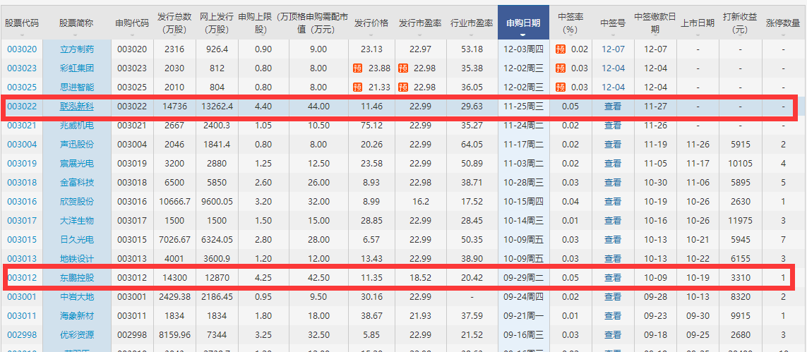 新股聯(lián)泓新科的申購(gòu)時(shí)間是11月25日,股票代碼是003022,申購(gòu)代碼003022是上市地點(diǎn)是 深圳證券交易所,發(fā)行價(jià)格是11.46元/股,發(fā)行市盈率是22.99,參考行業(yè)市盈率29.22,知道了聯(lián)泓新科的基本信息,下面我們來看一下聯(lián)泓新科打新收益怎么樣?