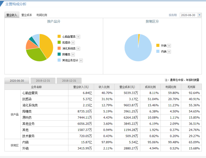 報(bào)告期內(nèi),公司主營(yíng)業(yè)務(wù)收入占比較高,其他業(yè)務(wù)收入主要為抗生素原料藥及包材貿(mào)易收入等。2020年1-6月?tīng)I(yíng)業(yè)收入下降主要因新冠肺炎疫情影響,患者門(mén)診量和住院量直線下降,公司抗感染藥物和消化系統(tǒng)類(lèi)藥物銷(xiāo)量有所減少。