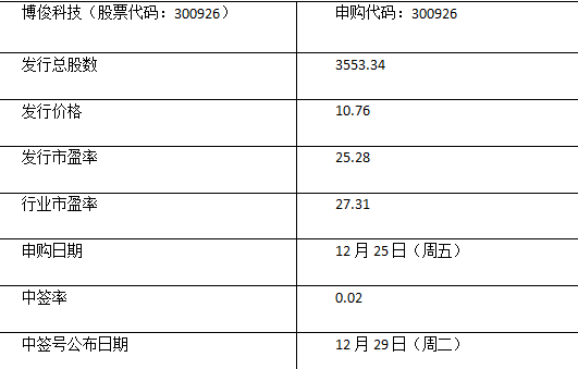 【博俊科技(300926)、股吧】申購(gòu)時(shí)間中簽率公布,搶先看300926博俊科技發(fā)行價(jià)格上市能賺多少錢(qián)?近日博俊科技發(fā)布新股信息,300926博俊科技申購(gòu)時(shí)間為2020年12月25日,博俊科技行業(yè)市盈率,發(fā)行價(jià)格10.76,中簽率0.02,發(fā)行市盈率25.28。想要打新的朋友們,可以關(guān)注其相關(guān)信息。