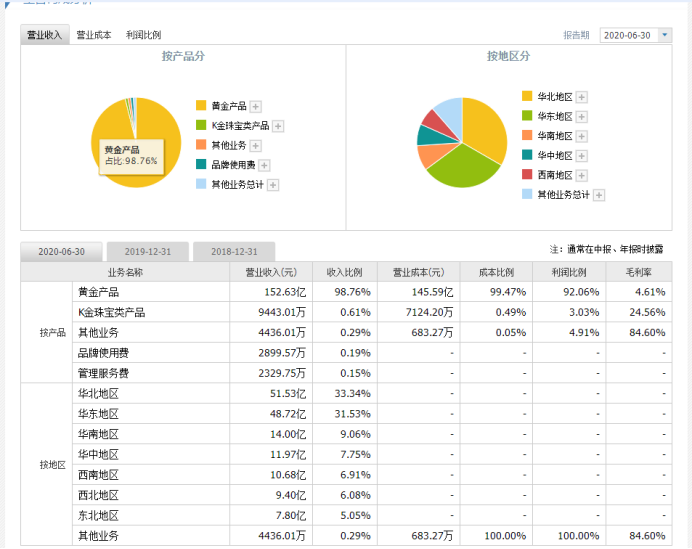 公司主營業(yè)務(wù)收入包括黃金產(chǎn)品、K金珠寶類產(chǎn)品、品牌使用費(fèi)和管理服務(wù)費(fèi)。黃金產(chǎn)品主要為金條、黃金首飾及黃金制品;K金珠寶類產(chǎn)品主要為金銀制品、銀產(chǎn)品、K金產(chǎn)品、鉑金產(chǎn)品、鉆石產(chǎn)品及玉等。