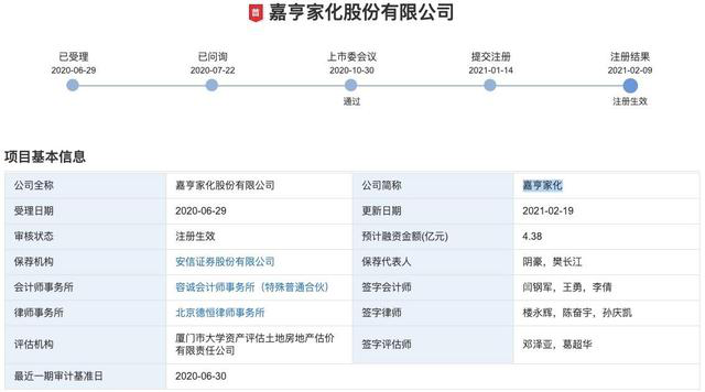2月19日,據(jù)證監(jiān)會披露,近日,證監(jiān)會按法定程序同意嘉亨家化股份有限公司(以下簡稱“嘉亨家化”)創(chuàng)業(yè)板首次公開發(fā)行股票注冊。嘉亨家化本次擬在深交所創(chuàng)業(yè)板公開發(fā)行新股2520萬股,募集資金4.38億元,保薦機構(gòu)為安信證券。