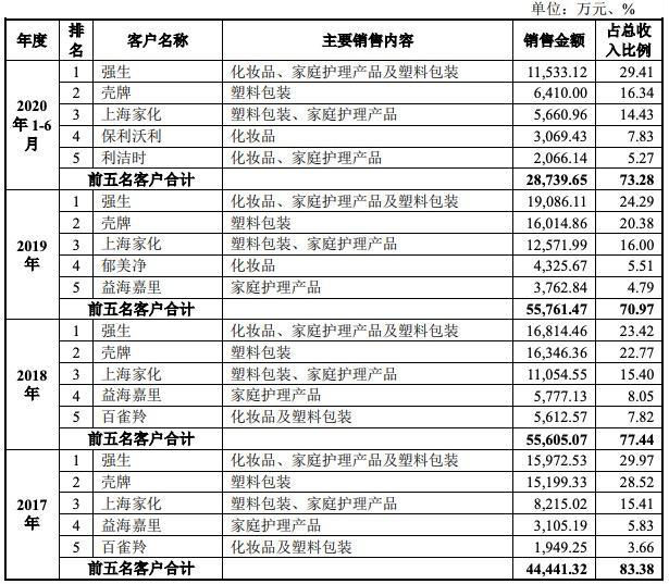 2017-2019年及2020年上半年,嘉亨家化前五名客戶的銷售金額分別為4.44億元、5.56億元、5.58億元及2.87億元,在營業(yè)收入中的占比分別為83.38%、77.44%、70.97%及73.28%。而且,報告期內(nèi),前三大客戶一直未變,依次分別為強生、殼牌和上海家化,這三大客戶銷售收入在營業(yè)收入中的占比分別為73.9%、61.59%、60.67%和60.18%。盡管報告期內(nèi)前五大客戶收入占比有所下滑,但嘉亨家化對于前五大客戶的依賴程度,尤其是對前三大客戶的依賴程度,可見一斑。