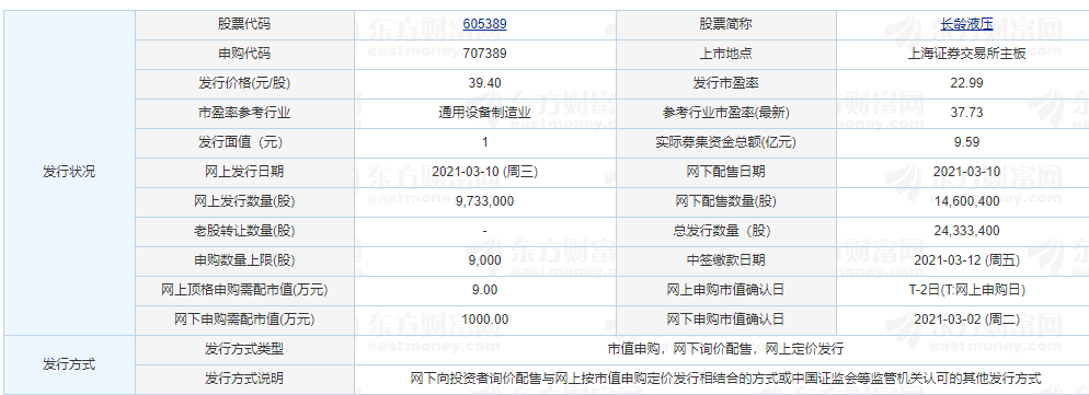近日主板新股605389【長齡液壓(605389)、股吧】發(fā)布信息,長齡液壓申購時(shí)間為2021年3月10日,中簽號(hào)公布時(shí)間為2021年3月12日,長齡液壓行業(yè)市盈率37.95,發(fā)行市盈率為22.99,發(fā)行價(jià)格為39.40。