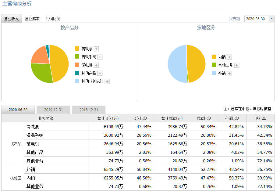 公司主要產(chǎn)品按類型可分為清洗泵、清洗系統(tǒng)、微電機和其他產(chǎn)品,其中清洗系統(tǒng)主要為洗滌液罐總成、洗滌管路、洗滌噴嘴、加液管等;微電機主要為后備箱及側(cè)門電機、風(fēng)扇電機、清洗電機、ABS電機等;其他產(chǎn)品主要為清洗泵配件、清洗系統(tǒng)配件、電機配件、液位傳感器及循環(huán)泵等產(chǎn)品。報告期內(nèi),清洗泵產(chǎn)品占主營業(yè)收入平均比例為45.86%;清洗系統(tǒng)占主營業(yè)收入的平均比例為37.01%;微電機占主營業(yè)務(wù)收入的平均比例為14.14%。
