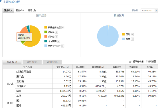 報(bào)告期內(nèi),公司主營(yíng)業(yè)務(wù)收入主要為烘焙應(yīng)用油脂、淡奶油、進(jìn)口品以及其他相關(guān)產(chǎn)品的銷售收入。