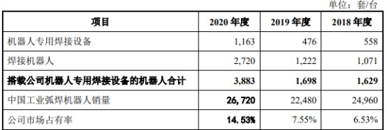 報告期內(nèi),公司對外銷售的機器人專用焊接設(shè)備、焊接機器人及市場占有率情況如下: