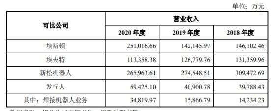 公司主要從事焊接機器人、工業(yè)焊接設(shè)備的研發(fā)、生產(chǎn)與銷售,目前鮮有國內(nèi)上市公司中同時涉足上述兩塊業(yè)務(wù),因此公司就不同業(yè)務(wù)分別與可比上市公司進行比較。