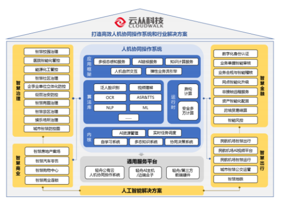 主營(yíng)業(yè)務(wù)概況 云從科技是一家提供高效人機(jī)協(xié)同操作系統(tǒng)和行業(yè)解決方案的人工智能企 業(yè),致力于助推人工智能產(chǎn)業(yè)化進(jìn)程和各行業(yè)智慧化轉(zhuǎn)型升級(jí)。公司一方面憑借 著自主研發(fā)的人工智能核心技術(shù)打造了人機(jī)協(xié)同操作系統(tǒng),通過(guò)對(duì)業(yè)務(wù)數(shù)據(jù)、硬 件設(shè)備和軟件應(yīng)用的全面連接,把握人工智能生態(tài)的核心入口,為客戶提供信息 化、數(shù)字化和智能化的人工智能服務(wù);另一方面,公司基于人機(jī)協(xié)同操作系統(tǒng), 賦能智慧金融、智慧治理、智慧出行、智慧商業(yè)等應(yīng)用場(chǎng)景,為更廣泛的客戶群 體提供以人工智能技術(shù)為核心的行業(yè)解決方案。 在技術(shù)水平方面,云從科技匯聚了眾多優(yōu)秀人才組成人工智能研發(fā)團(tuán)隊(duì),擁 有自主可控且不斷創(chuàng)新的人工智能核心技術(shù),實(shí)現(xiàn)了從智能感知到認(rèn)知、決策的 核心技術(shù)閉環(huán)。