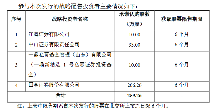 公告顯示,4家戰(zhàn)投中,中山證券擬認(rèn)購33萬股,江海證券、一鼎私募基金管理(山東)有限公司(一鼎新精選1號(hào)私募證券投資基金)均擬認(rèn)購10萬股,國金證券(600109)擬認(rèn)購206.26萬股。