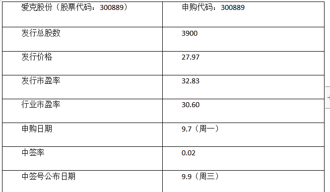 近日300889愛克股份發(fā)布新股信息,愛克股份申購時(shí)間為2020年9月7日,中簽率為0.02,中簽號(hào)在9月9號(hào)早上公布,發(fā)行價(jià)格為27.97。想要打新的朋友們,本篇文章會(huì)持續(xù)更新,可以收藏,9月8日晚上本文更新中簽號(hào)結(jié)果。