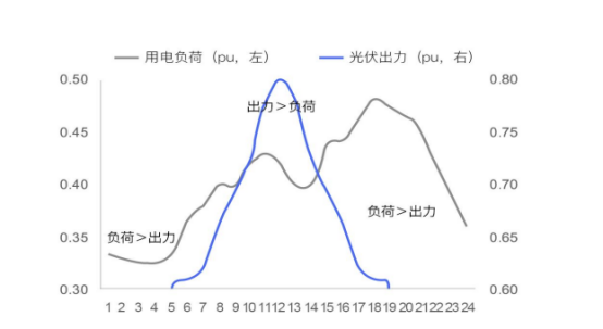新能源發(fā)電功率預(yù)測(cè)是基于新能源電力波動(dòng)性和不穩(wěn)定性特征而產(chǎn)生的一 種需求,其需求主要來(lái)自于電網(wǎng)端量化新能源發(fā)電規(guī)模,可視化新能源發(fā)電曲線, 并據(jù)此作出及時(shí)、合理的發(fā)電規(guī)劃,實(shí)現(xiàn)發(fā)電端和用電端的實(shí)時(shí)平衡,維持電網(wǎng) 穩(wěn)定的需要;同時(shí),新能源發(fā)電企業(yè)在內(nèi)部管理中也需要依靠對(duì)下屬電站發(fā)電功 率的預(yù)測(cè)作出各項(xiàng)管理決策。 具體來(lái)說(shuō),首先,新能源電力具有波動(dòng)性和不穩(wěn)定性特征。新能源發(fā)電量的 大小與風(fēng)力的大小、太陽(yáng)光照的強(qiáng)弱有著很大的關(guān)系,風(fēng)力越大,發(fā)電量越大, 同理太陽(yáng)光照越強(qiáng),光伏發(fā)電量也越大;而由于風(fēng)力和太陽(yáng)光照強(qiáng)度隨時(shí)在變化, 風(fēng)力可能時(shí)大時(shí)小、光照可能忽強(qiáng)忽弱,上述自然現(xiàn)象很難人為控制,不確定性 較大,因此導(dǎo)致了風(fēng)力發(fā)電和光伏發(fā)電的波動(dòng)性和間歇性特征。這一波動(dòng)性和間 歇性特征導(dǎo)致了新能源發(fā)電量與用電量的不匹配,如下圖光伏發(fā)電的發(fā)電量曲線 與用電量曲線所示,在一天的凌晨及早晨,由于太陽(yáng)輻照強(qiáng)度不夠,發(fā)電端的發(fā) 電出力不足,此時(shí)會(huì)出現(xiàn)用電負(fù)荷大于發(fā)電出力,電力需求大于供給的情況;而 在一天的中午,由于太陽(yáng)輻照強(qiáng)度較好,發(fā)電端的發(fā)電出力大于用電負(fù)荷,又會(huì) 出現(xiàn)電力供給大于需求的情況。