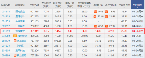2022年4月26日是001319【銘科精技(001319)、股吧】新股申購(gòu)日期,按照規(guī)律將會(huì)在T+2日公布中簽號(hào)。公布中簽號(hào)的時(shí)間將會(huì)在4月28日,而且是這一天要進(jìn)行中簽繳款,按照慣例情況,中簽號(hào)會(huì)在前一天晚上公布,每個(gè)中簽號(hào)碼只能認(rèn)購(gòu)500股股票。