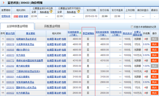 例如,3月5日詢價截止的藍思科技,從申報明細里可以看到,那些已經(jīng)被剔除的基金,就代表沒有打中該新股了。而未被剔除的基本上都能獲得配售,除了兩種情況:(1)參與網(wǎng)下申購的投資者未在2015年3月10日(T日)9:30~15:00通過網(wǎng)下發(fā)行電子平臺錄入申購單信息。(2)配售對象劃出申購資金的賬戶與在網(wǎng)下發(fā)行電子平臺登記備案的資金賬戶不一致、申購資金不足或未在規(guī)定的時間內(nèi)到賬的,其新股申購全部無效。所以,在新股公告配售情況之前,投資者已經(jīng)可以事先看出端倪。