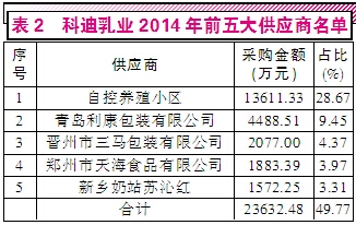 科迪乳業(yè)2015年4月發(fā)布了新版招股說明書,其招股說明書中詳細(xì)披露了2014年前五大供應(yīng)商的情況,然而筆者仔細(xì)核對(duì)發(fā)現(xiàn),在其前五大供應(yīng)商名單中,根本沒有新美星的蹤跡,那是否是因?yàn)樾旅佬堑匿N售額度太低,沒有進(jìn)入前五名供應(yīng)商名單呢?在科迪乳業(yè)公布的五大供應(yīng)商名單中,科迪乳業(yè)對(duì)第五大供應(yīng)商新鄉(xiāng)奶站蘇沁紅的采購金額為1572.25萬元,采購金額遠(yuǎn)遠(yuǎn)低于新美星招股書中所披露的對(duì)科迪乳業(yè)3000多萬元的銷售收入,如果新美星披露的這一銷售金額屬實(shí),則其至少應(yīng)該位列科迪乳業(yè)供應(yīng)商名單的前三位,然而事實(shí)卻不是如此。如今雙方提供的數(shù)據(jù)鬧起烏龍,根本對(duì)不上,這又怎么一回事呢?是新美星銷售數(shù)據(jù)造假,還是科迪乳業(yè)信息披露有誤呢?