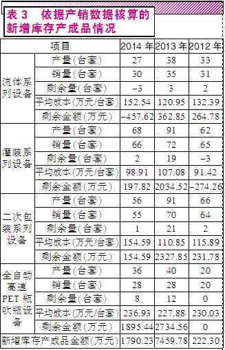 我們知道,企業(yè)的庫存與產(chǎn)銷之間存在著一定的邏輯關(guān)系,企業(yè)當(dāng)年生產(chǎn)的產(chǎn)品經(jīng)過銷售以后,剩下的便是當(dāng)年新增庫存產(chǎn)成品。據(jù)招股書介紹,新美星的主要產(chǎn)品為四大類設(shè)備,即流體系列設(shè)備灌裝系列設(shè)備、二次包裝系列設(shè)備、和全自動(dòng)高速PET瓶吹瓶設(shè)備,依據(jù)其四大類設(shè)備每年的生產(chǎn)和銷售情況,很容易計(jì)算出各種設(shè)備每年新增的產(chǎn)成品數(shù)量,相應(yīng)地,再依據(jù)生產(chǎn)每種設(shè)備的平均成本,也可以計(jì)算出其新增庫存商品的金額。經(jīng)計(jì)算,新美星2012年至2014年新增庫存商品的金額分別為222.30萬元、7459.78萬元和1790.23萬元。