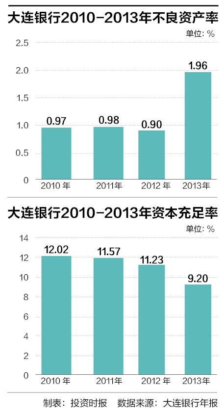 但高速增長的同時(shí),近幾年大連銀行不良率高企和資本充足率不足的問題也頗為嚴(yán)重,2013年末大連銀行的不良貸款余額為23.38億元,不良貸款率為1.96%,遠(yuǎn)高于同業(yè)的平均水平;而同期大連銀行資本充足率為9.2%,核心一級資本充足率和一級資本充足率為7.49%,位于同業(yè)較低水平。