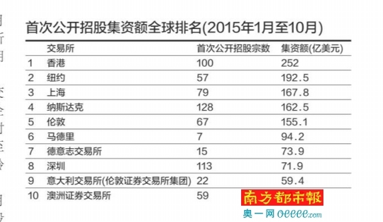 香港券商及業(yè)界均對(duì)港交所今年的IPO集資額位列全球第一頗有信心。南都記者查閱獲悉,在首次公開(kāi)招股集資額排名來(lái)看,截至1月至10月,香港交易所錄得IPO上市100宗,集資額為252億美元。緊隨其后的是紐約交易所,57宗IPO的集資額高達(dá)192.5億美元。