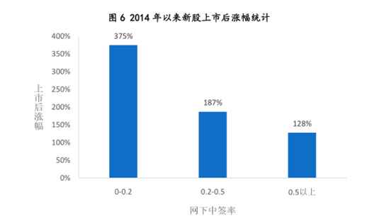 統(tǒng)計(jì)顯示,2014 年以來新股上市后表現(xiàn)與新股網(wǎng)下中簽率存在明顯的負(fù)相關(guān)關(guān)系。統(tǒng)計(jì)顯示,2014年以來的新股中,網(wǎng)下中簽率在 0.2%以下的上市后表現(xiàn)最優(yōu),平均漲幅達(dá)375%。