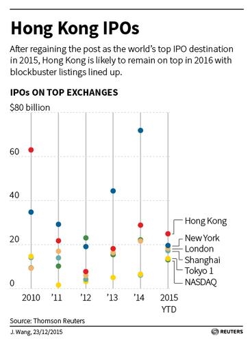 在今年稍早的股票牛市行情下,很多中資券商和銀行紛紛進行IPO籌資,為自身保證金貸款業(yè)務提供資金,并提高核心資本水平。2015年香港的大型IPO包括國泰君安證券的48億美元IPO,以及中國華融資產管理IPO集資25億美元。