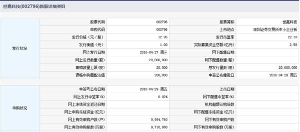 【世嘉科技5月10日中小板上市】根據(jù)交易所9日公告,蘇州市世嘉科技股份有限公司(以下簡(jiǎn)稱“世嘉科技”)股票將于2016年5月10日在深圳證券交易所上市。本次發(fā)行采用網(wǎng)上按市值申購(gòu)向公眾投資者直接定價(jià)發(fā)行的方式,網(wǎng)上發(fā)行數(shù)量2,000萬(wàn)股,發(fā)行價(jià)格為12.95元/股,股票簡(jiǎn)稱為世嘉科技;股票代碼為002796。 根據(jù)交易所9日公告,蘇州市世嘉科技股份有限公司(以下簡(jiǎn)稱“世嘉科技”)股票將于2016年5月10日在深圳證券交易所上市。本次發(fā)行采用網(wǎng)上按市值申購(gòu)向公眾投資者直接定價(jià)發(fā)行的方式,網(wǎng)上發(fā)行數(shù)量2,000萬(wàn)股,發(fā)行價(jià)格為12.95元/股,股票簡(jiǎn)稱為世嘉科技;股票代碼為002796.