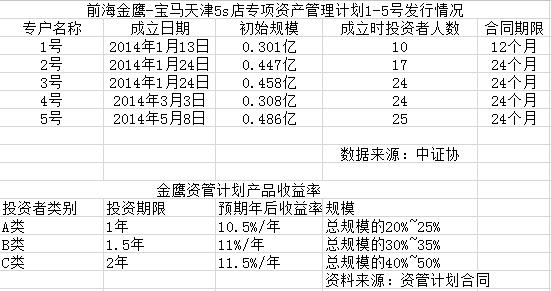 中國(guó)證券業(yè)協(xié)會(huì)網(wǎng)站的備案信息顯示,金鷹寶馬專項(xiàng)資管計(jì)劃五期(即1~5號(hào)產(chǎn)品)發(fā)行時(shí)間分別為2014年1月13日、1月24日、1月24日、3月3日、5月8日。其中,2~5號(hào)資管計(jì)劃的產(chǎn)品結(jié)構(gòu)有A、B、C類別之分,A類別投資期限1年,預(yù)期年化收益率10%,B類投資期限1.5年,預(yù)期年化收益率10.5%,C類投資期限2年,預(yù)期年化收益率11%。
