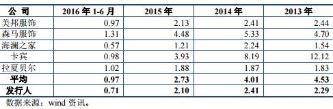 太平鳥2013年至2016年1-6月存貨周轉率分別為2.29、2.41、2.10、0.71.