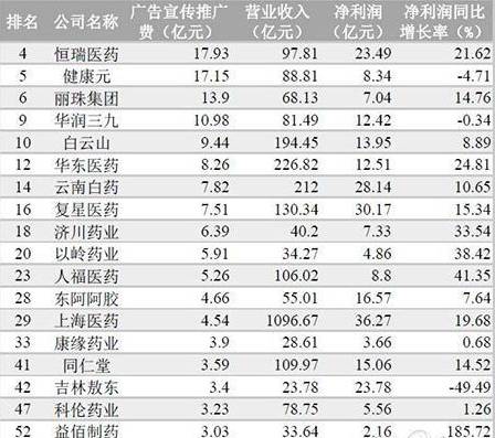 有統(tǒng)計數(shù)據(jù)顯示,“2016年上半年上市公司廣告投入榜”,在廣告投入排名前55位的上市公司中,恒瑞醫(yī)藥、健康元、麗珠集團(tuán)、華潤三九、白云山等19家醫(yī)藥企業(yè)位列其中。
