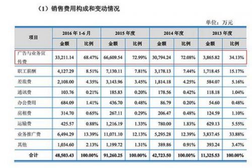 但毛利率高,并不代表一定能賺錢,匯仁藥業(yè)是賺的多,花的更多。招股說明書顯示,匯仁腎寶片可謂是拿著真金白銀砸出來的產(chǎn)品。數(shù)據(jù)顯示,2013至2015年度及2016年1-6 月,匯仁藥業(yè)的廣告與業(yè)務(wù)宣傳費分別為 3865.82 萬元、3.07億元、6.66億元、3.32億元。