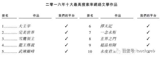 當(dāng)前,閱文集團(tuán)簽約作家主要有幾大類(lèi),分別是公眾作家、普通作家、大神作家、白金作家。2016年10大最高搜索率的網(wǎng)絡(luò)作品有9部來(lái)自閱文集團(tuán)。
