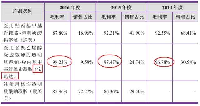 2014-2016年,愛美客的綜合毛利率為93.73%、91.31%、87.19%。其中,主營產(chǎn)品中,高端產(chǎn)品寶尼達(dá)的毛利率高達(dá)98%。