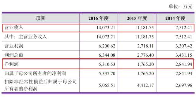 2014-2016年,愛美客的營業(yè)收入分別為7512萬、1.12億、1.4億。凈利潤為2841萬、1765萬、5310萬。