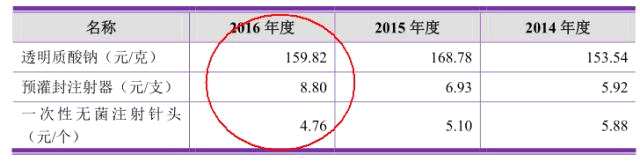 這三個(gè)材料2016年的采購價(jià)格分別為:透明質(zhì)酸鈉159元/克,注射器8.8元/支,針頭4.76元/個(gè)。水電成本暫不考慮。