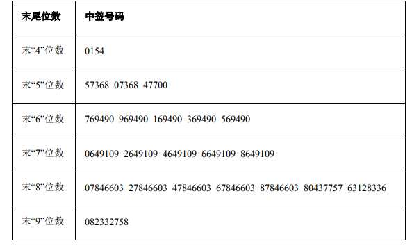 凡參與網上定價發(fā)行申購深圳市澄天偉業(yè)科技股份有限公司首次公開發(fā)行A股股票的投資者持有的申購配號尾數與上述號碼相同的,則為中簽號碼。中簽號碼共有34,000個,每個中簽號碼只能認購500股深圳市澄天偉業(yè)科技股份有限公司A股股票。