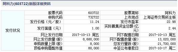 中國證券網(wǎng)訊 根據(jù)交易所公告,無錫阿科力科技股份有限公司于2017年10月13日進(jìn)行網(wǎng)上和網(wǎng)下申購。本次發(fā)行股份數(shù)量為 2,170 萬股,全部為新股。回?fù)軝C(jī)制啟動前,網(wǎng)下初始發(fā)行 1,302 萬股,占本次發(fā)行數(shù)量的 60%; 網(wǎng)上初始發(fā)行數(shù)量為 868 萬股,占本次發(fā)行數(shù)量的 40%。