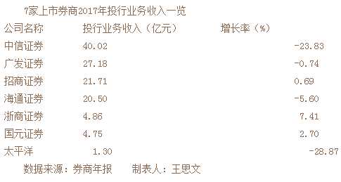 此外,截至記者發(fā)稿,共有8家上市券商發(fā)布了2017年年報(bào),其中有數(shù)據(jù)顯示的7家券商中,4家券商投行業(yè)務(wù)收入保持下降趨勢(shì)。具體來(lái)看,中信證券的投行業(yè)務(wù)收入居首位,暫時(shí)領(lǐng)先其他券商,達(dá)40.02億元,同比下降23.83%。其次是廣發(fā)證券(000776) 和海通證券(600837) ,分別實(shí)現(xiàn)27.18億元和20.5億元,分別同比下降0.74%和5.6%;太平洋(601099) 證券的投行業(yè)務(wù)收入規(guī)模較小,為1.3億元,相比同期下降了28.87%。
