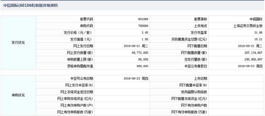 據(jù)交易所消息,中鋁國際今日申購。中鋁國際此次發(fā)行總數(shù)約2.96億股,網(wǎng)上發(fā)行為8877.2萬股,發(fā)行市盈率31.86倍,申購代碼為:780068,申購價(jià)格:3.45元,單一帳戶申購上限88000股,申購數(shù)量1000股整數(shù)倍。