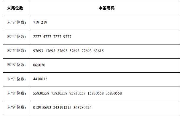 凡參與本次網(wǎng)上定價(jià)發(fā)行申購(gòu)鄭州銀行股份有限公司A股股票的投資者持有的申購(gòu)配號(hào)尾數(shù)與上述號(hào)碼相同的,則為中簽號(hào)碼。中簽號(hào)碼共有1,080,000個(gè),每個(gè)中簽號(hào)碼只能認(rèn)購(gòu)500股鄭州銀行股份有限公司A股股票。