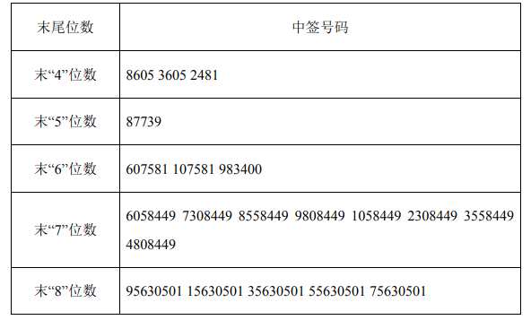據(jù)交易所公告,愛朋醫(yī)療(300753)12月5日晚間披露中簽結(jié)果,中簽號(hào)碼共有36,360個(gè),每個(gè)中簽號(hào)碼只能認(rèn)購500股。中簽號(hào)碼如下: