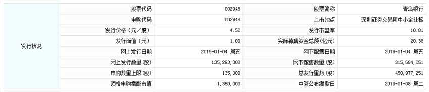 據(jù)交易所公告,青島銀行今日申購,公司網(wǎng)上發(fā)行135,293,000股,申購代碼:002948 ,申購價格:4.52元,單一賬戶申購上限135,000股。