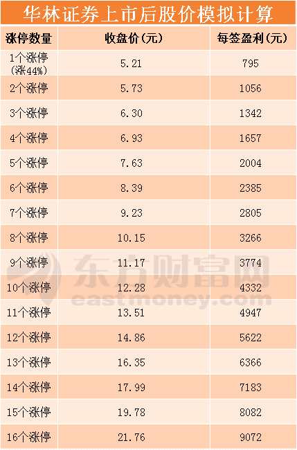 附:華林證券上市后每簽盈利模擬計算