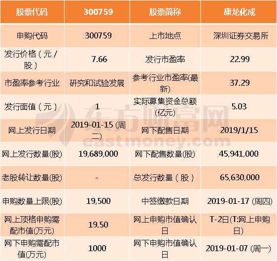 康龍化成此次發(fā)行總數(shù)6563萬股,網(wǎng)上發(fā)行1968.9萬股,發(fā)行市盈率22.99倍,申購代碼為:300759,申購價格:7.66元,單一帳戶申購上限1.95萬股,申購數(shù)量500股整數(shù)倍。