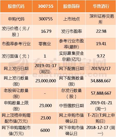 華致酒行此次發(fā)行總數(shù)約5788.87萬股,網(wǎng)上發(fā)行2300萬股,發(fā)行市盈率22.98倍,申購代碼為:300755,申購價格:16.79元,單一帳戶申購上限2.3萬股,申購數(shù)量500股整數(shù)倍。