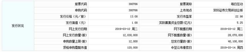 據(jù)交易所公告,每日互動(dòng)今日申購(gòu),此次發(fā)行總股數(shù)為40,100,000股,申購(gòu)代碼:300766,申購(gòu)價(jià)格:13.08元,單一賬戶(hù)申購(gòu)上限1.2萬(wàn)股,頂格申購(gòu)需配市值12萬(wàn)元。